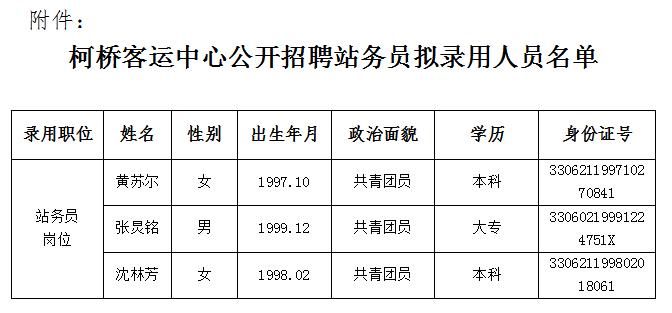 紹興柯橋客運(yùn)中心有限公司因工作需要,經(jīng)國(guó)資辦批準(zhǔn)面向社會(huì)公開(kāi)招聘基層類(lèi)崗位站務(wù)員3人,通過(guò)筆試、面試、素質(zhì)考察、體檢、政審考察等程序后,擬錄用黃蘇爾等3位同志。現(xiàn)予以公示,并就有關(guān)事項(xiàng)通告如下: