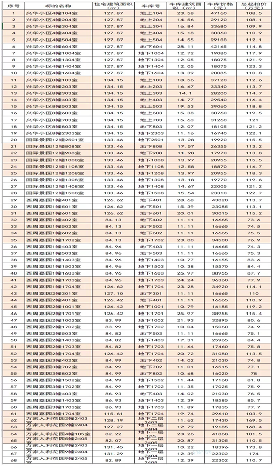 興華小區(qū)、國際景園、西周嘉園、萬家人利花園共計(jì)68套住宅,建筑面積約:82.07㎡至134.15㎡不等,起拍價73.6萬元至174萬元不等。